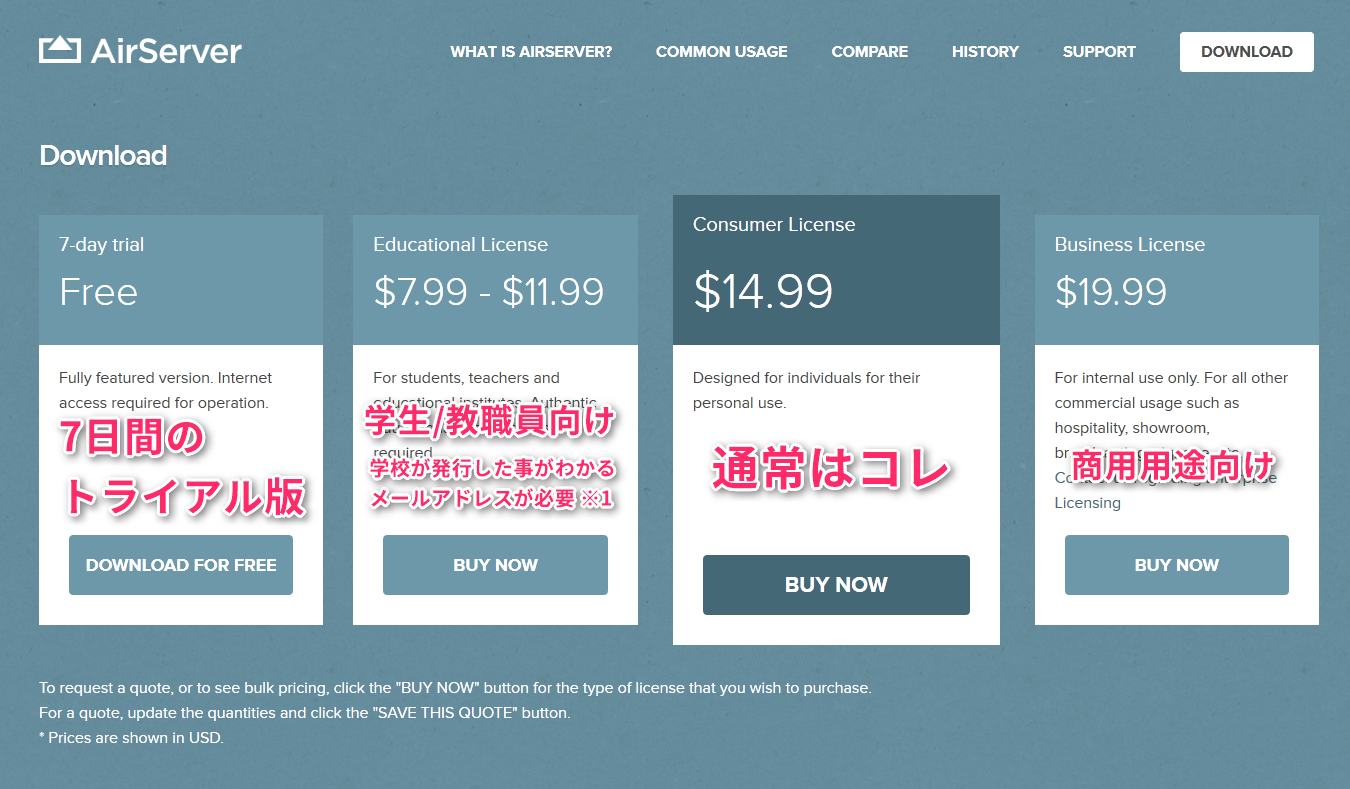 以下は Windows 10 64bit[core i7 6700k]、iPhone 6s Plus で使用した情報ですAirServer - 学生なら1ライセンス \1800, 通常は \2300 (2016.07/15 現在)